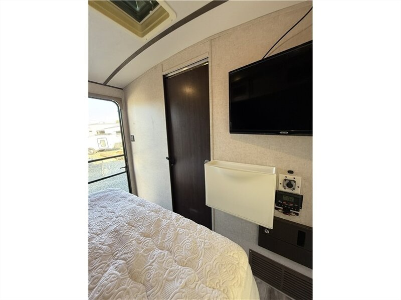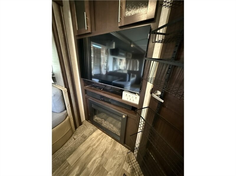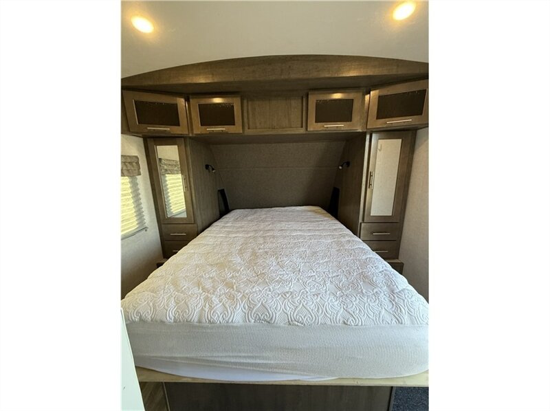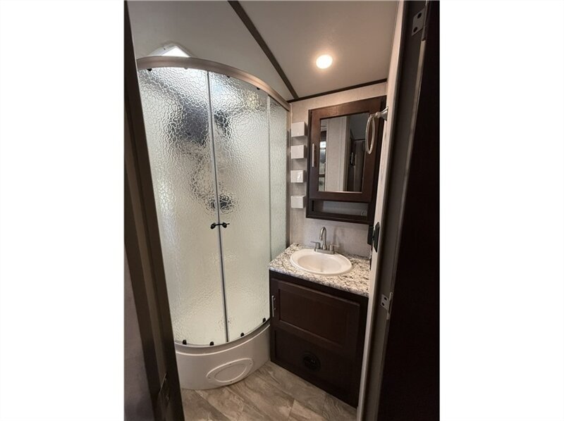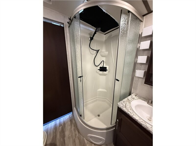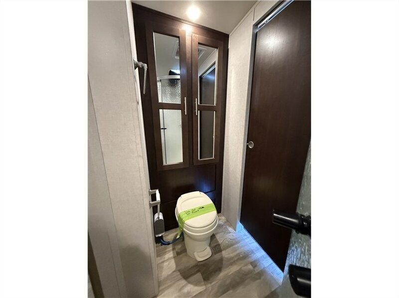 Bathroom: The walk-through bathroom has a radius glass shower, a toilet, a sink, and a linen closet. Some owners on RV Insider have reported issues with plumbing and installation in the bathroom.
