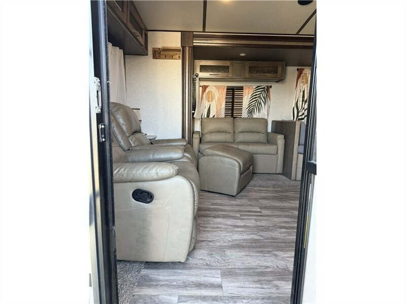Living area: The main living area features opposing slide-outs, creating a spacious feel. It includes a sofa that folds out into a bed, a booth dinette that also converts into a bed, and two rear swiveling rocker chairs.