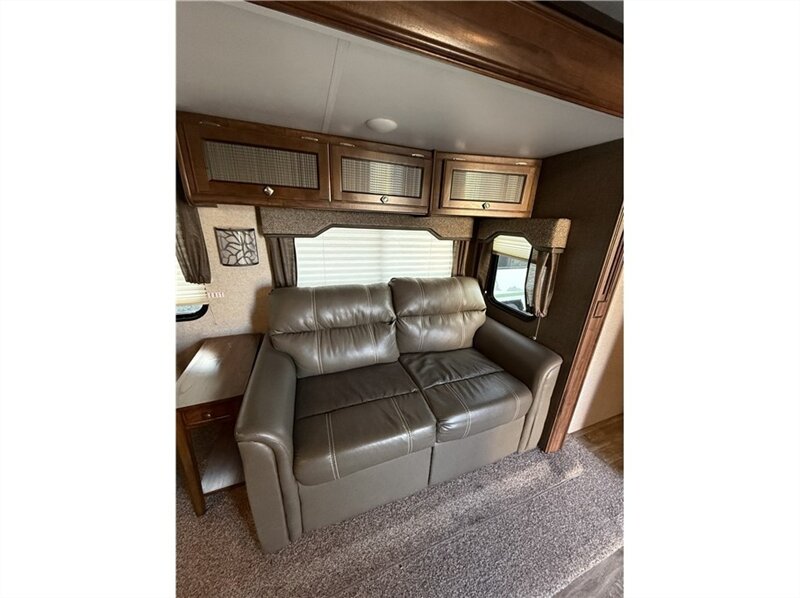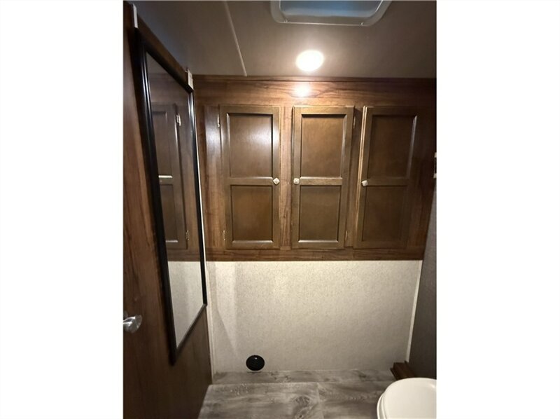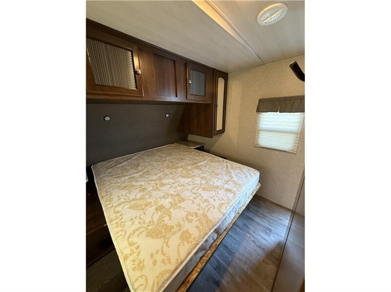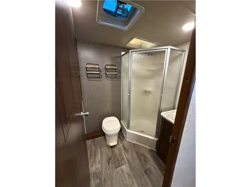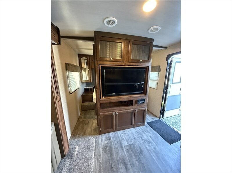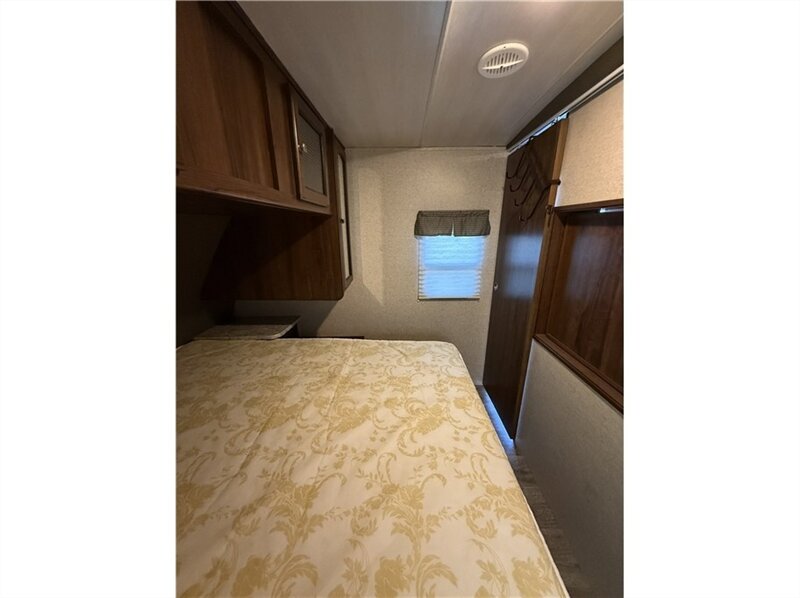Master bedroom: Equipped with an RV queen bed, overhead storage, and nightstands with 120-volt outlets. An optional swivel entertainment center allows the living room TV to be viewed from the bedroom.