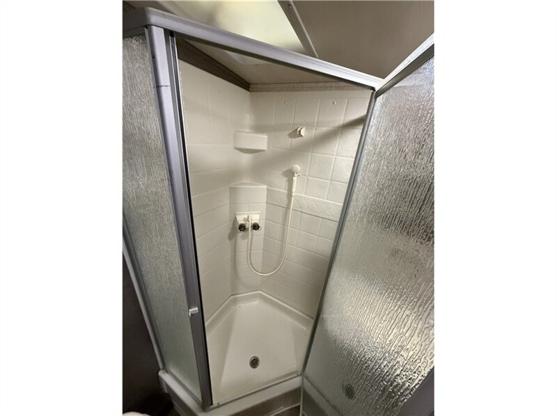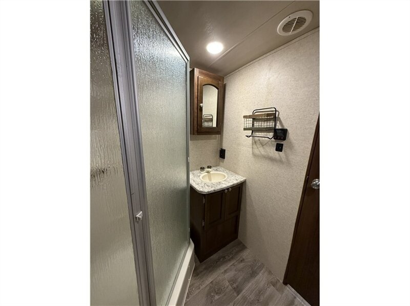 Bathroom: A rear bathroom with a large wardrobe, corner shower, hardwood medicine cabinet, and a power vent.