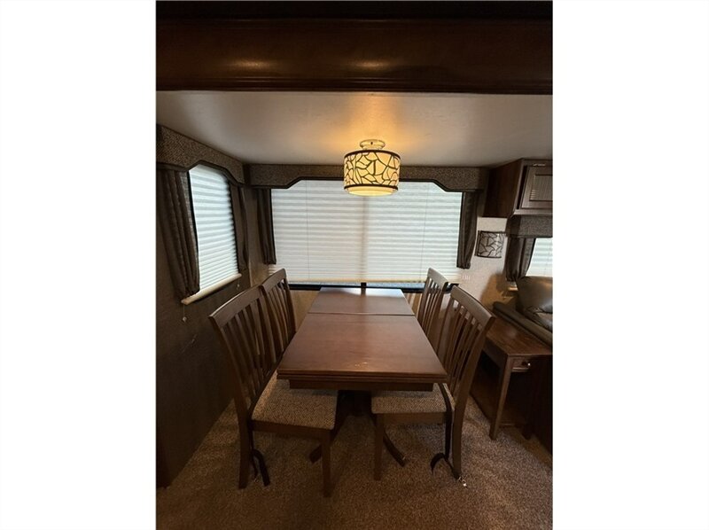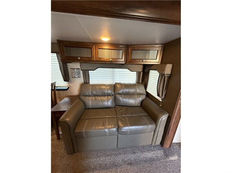 Living space: The trailer features a curvilinear ceiling and two slide-outs to create a more open living area. Other features include LED lighting, Beauflor flooring, and designer accent walls.