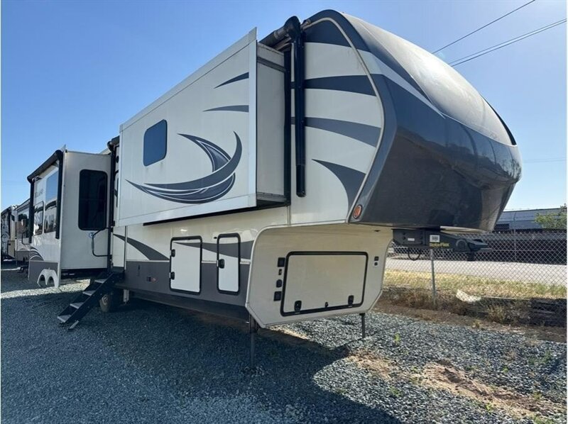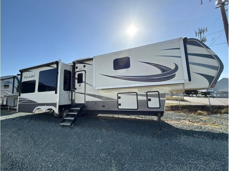 2020 VANLEIGH VILLANO 369FB is a four-slide, fifth-wheel RV that measures approximately 38 feet, 11 inches long, with a dry weight of about 14,100 lbs and a GVWR of 16,000 lbs. Key features include dual 15K BTU air conditioners, 70 gallons of fresh water capacity, a 45-gallon black water tank, a residential refrigerator, and a combination of carpet and vinyl flooring. The master suite features a king-size bed, a full walk-in shower, and a double-sink vanity in the master bath, while the unit also includes a convenient half bath.