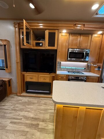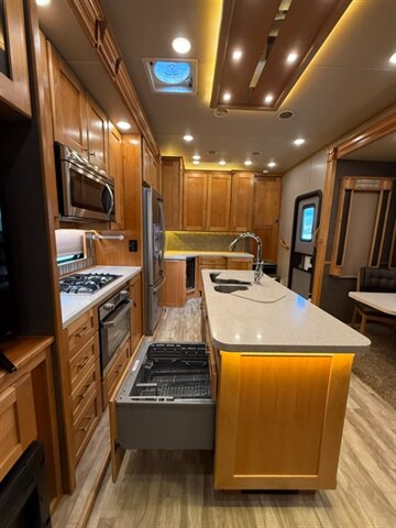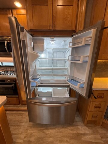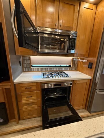 • Kitchen: Equipped with a residential 18 cu. ft. French door refrigerator, a stainless-steel convection microwave and oven, and a 1,000-watt pure sine wave inverter.