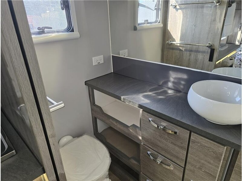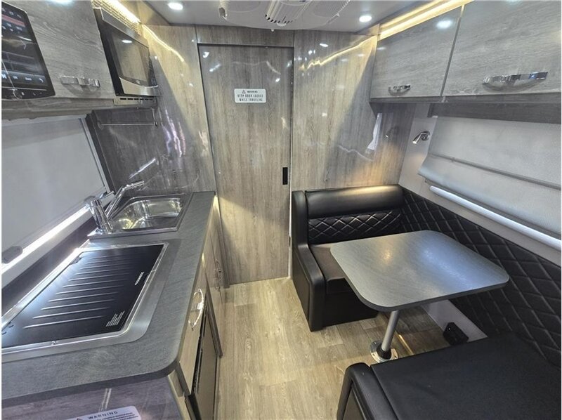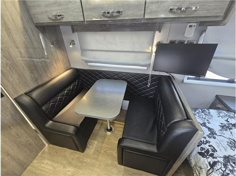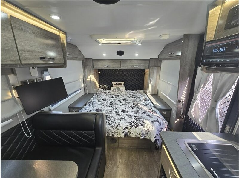 Step inside, and you're met with a luxurious interior that rivals high-end accommodations. The spacious layout features premium upholstery, offering a perfect blend of style and durability. The full kitchen is equipped with a gas cooktop, a microwave, and a refrigerator, enabling you to whip up gourmet meals in the wild. The cleverly designed dinette converts into additional sleeping space, accommodating up to four adventurers comfortably.
