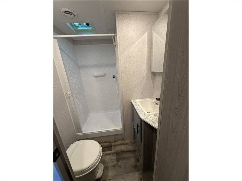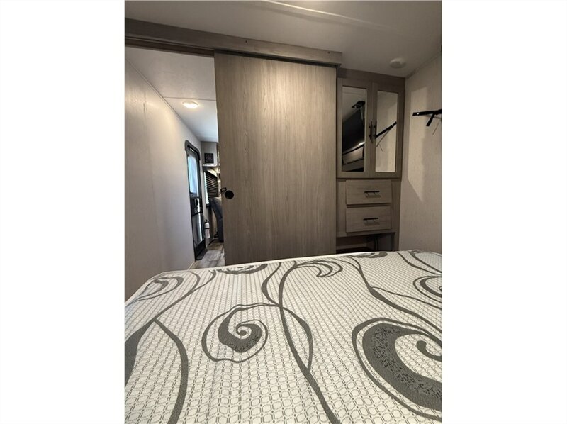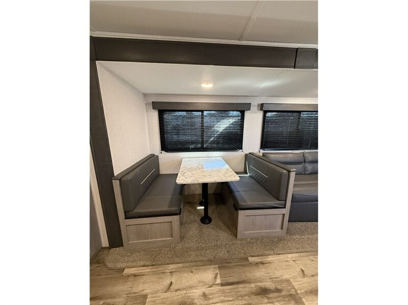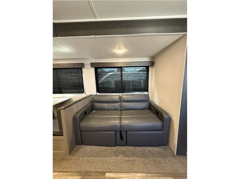 At night, retreat to the private bedroom that features a comfortable queen bed, offering a restful night's sleep. Additional sleeping arrangements are available with a convertible sofa and dinette, making this RV perfect for families or friends traveling together.