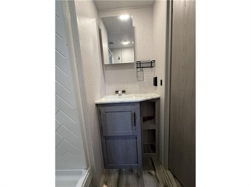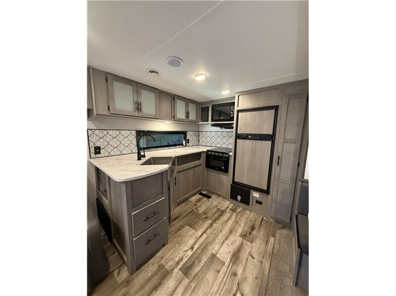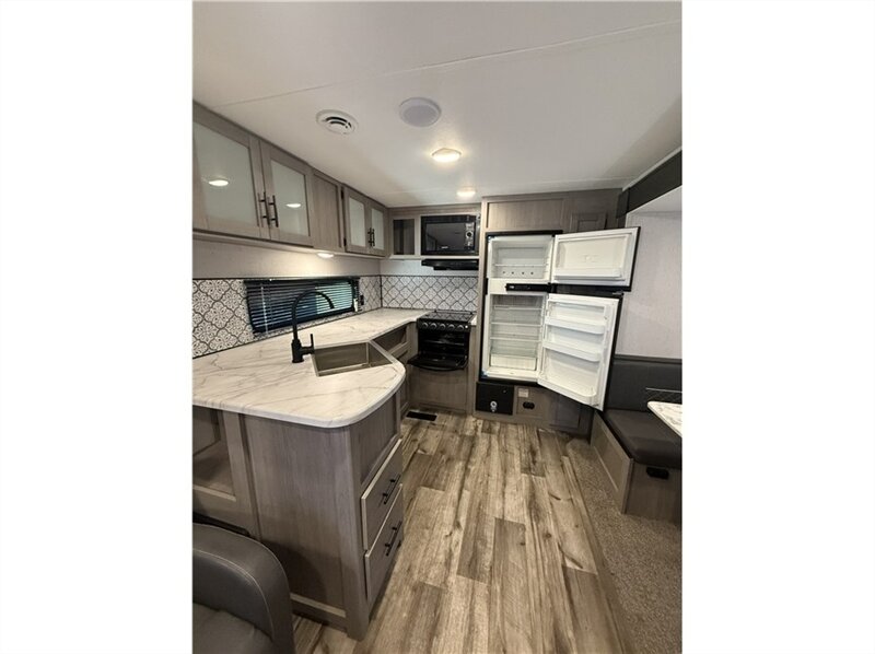 Step inside and prepare to be impressed by the sleek gray interior that exudes modern sophistication. The spacious layout is designed for maximum comfort, featuring a well-appointed kitchen that includes a large refrigerator, a three-burner cooktop, and a microwave, making meal prep a breeze no matter where your journey takes you. The generous countertop space and ample storage will have you feeling right at home, even in the wild.