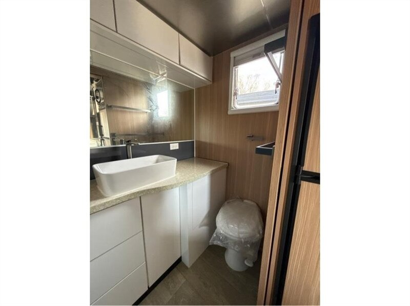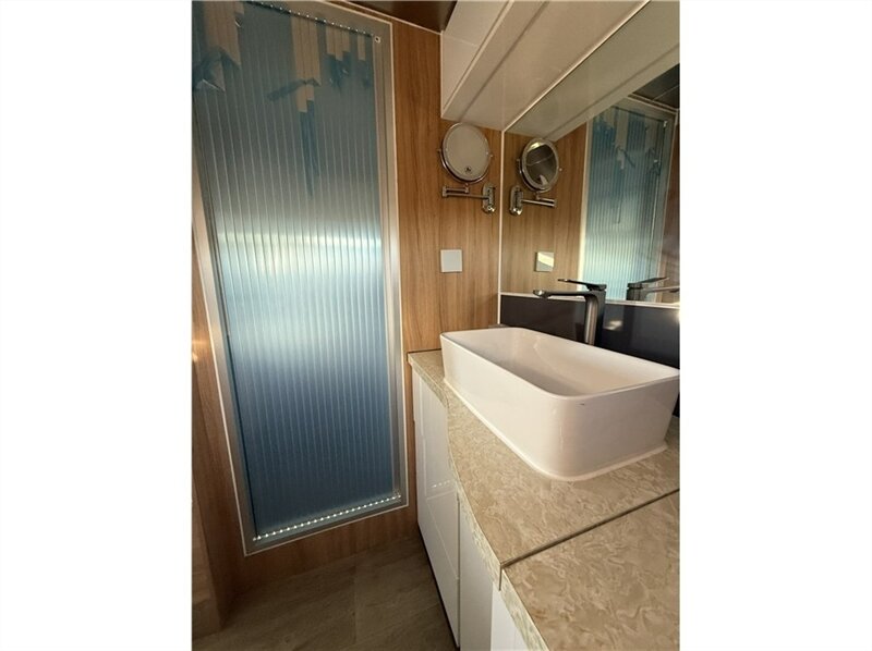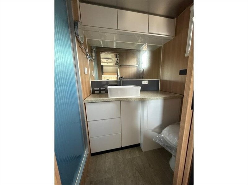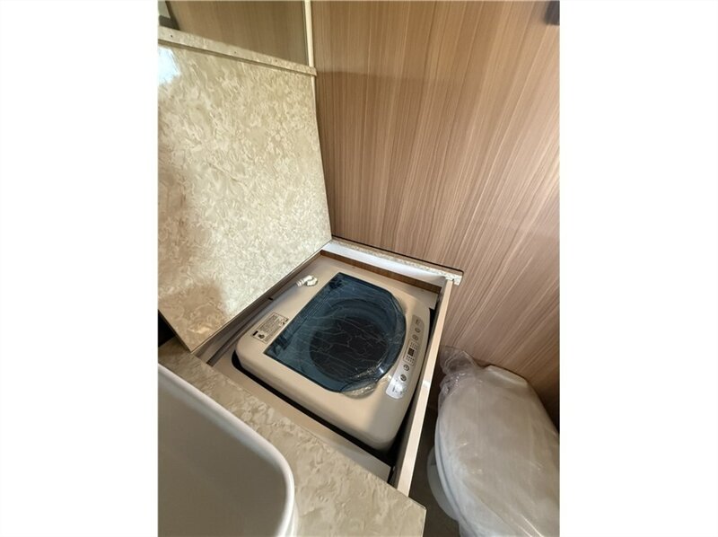 Bathroom: The full indoor bathroom includes a separate shower stall, a residential porcelain toilet, and a vanity. Earlier models included a washing machine, but it requires shore power to operate.