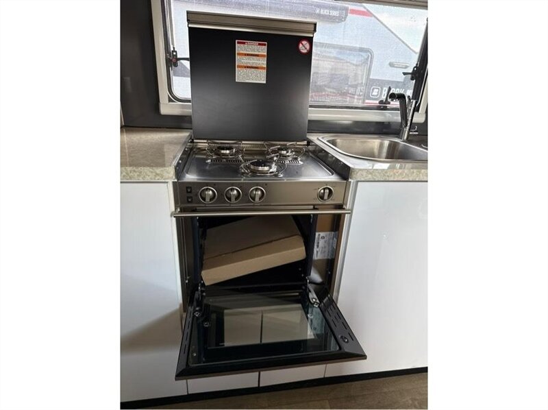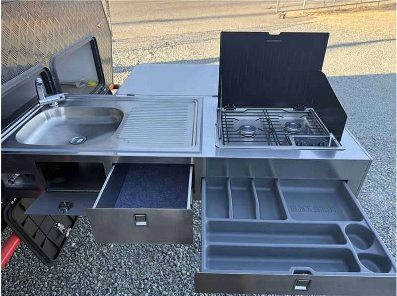 Outdoor kitchen: A slide-out, stainless steel outdoor kitchen includes a two-burner stove, a sink, and a outdoor shower.