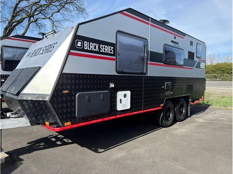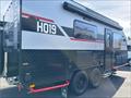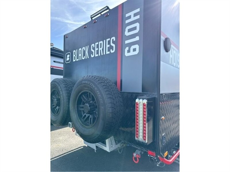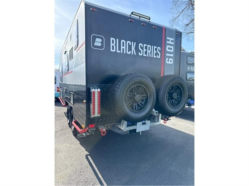 The 2025 Black Series HQ19 is an off-road travel trailer with specs including a 25-foot body length, a dry weight of 6,525 lbs, and a GVWR of 7,600 lbs. It features an armored chassis, independent suspension with quad shocks, and off-road tires, a 16,000 BTU heater, a 13,500 BTU air conditioner, and a 13-foot electric awning. The interior is designed to sleep up to four people and includes a rear bath, a queen bed, and an indoor TV.