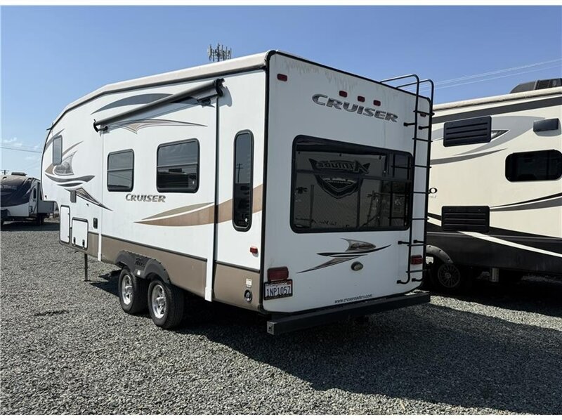 The 2013 Crossroads Cruiser 27RLX is a rear lounge-focused fifth wheel featuring a single slide-out, with a layout that typically includes a rear kitchen, a free-standing dinette with chairs and a sofa in the slide-out, a queen-sized bed, and a neo-angle shower in the bathroom. Key amenities often found in this model are a house-style table, a stereo system, and solid surface countertops.